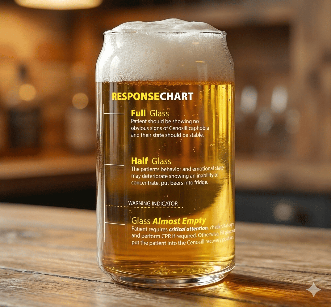 This can-shaped beer glass is a tongue-in-cheek tribute to every beer lover who knows that a dangerously low pour deserves immediate attention. Featuring a clean, modern response chart printed directly onto the glass, it tracks the emotional and physical condition of the “patient” as beer levels decline.